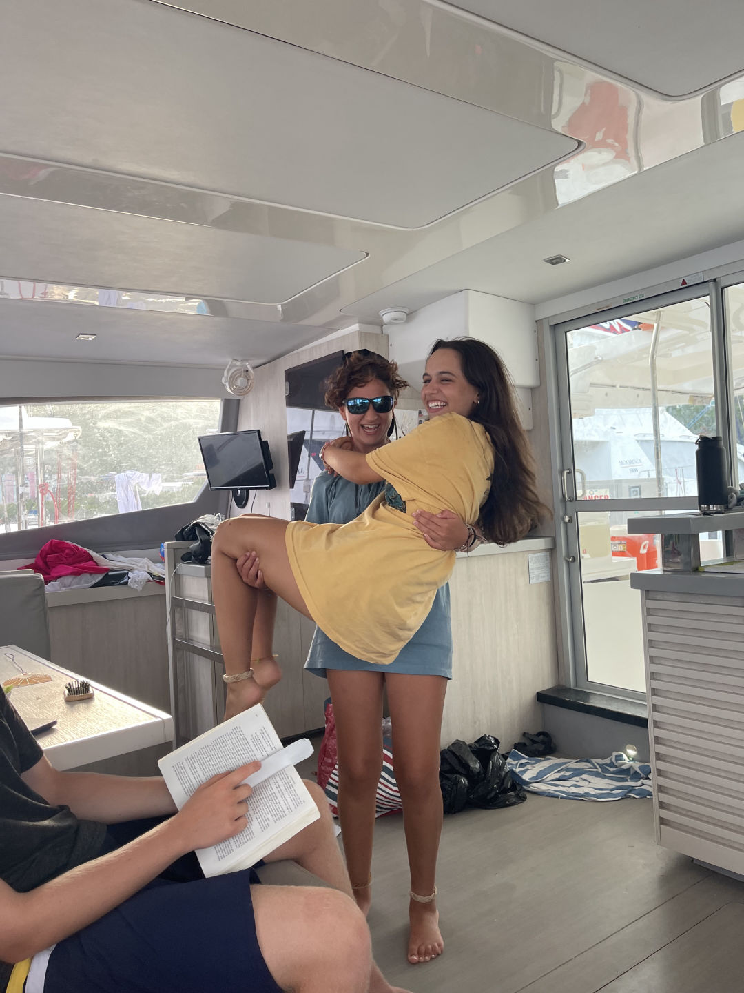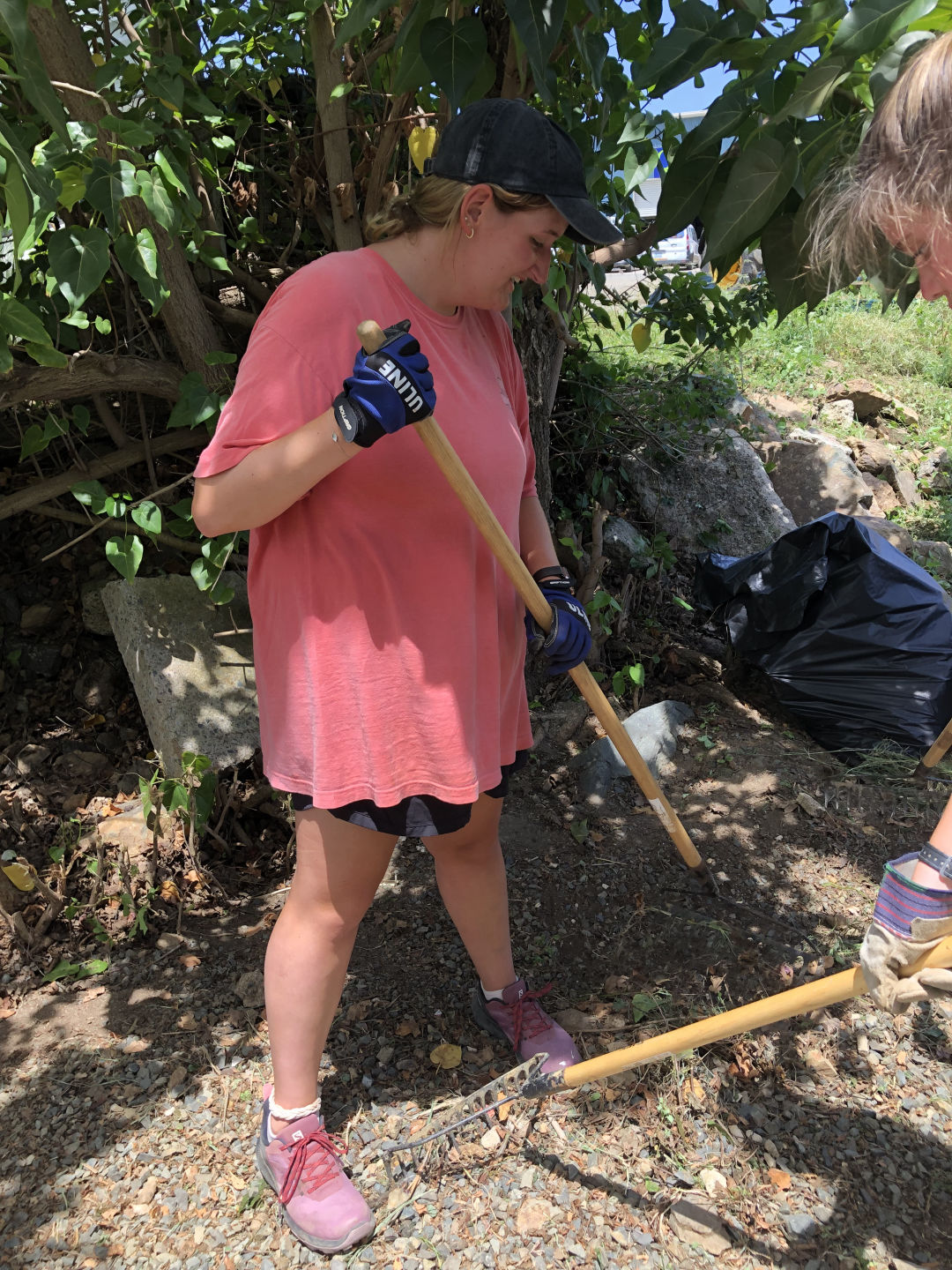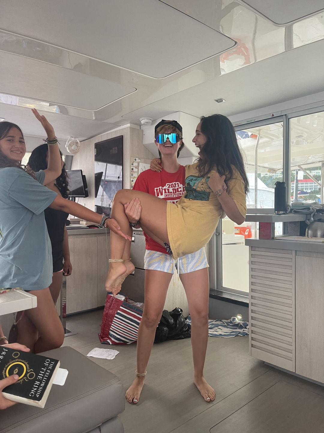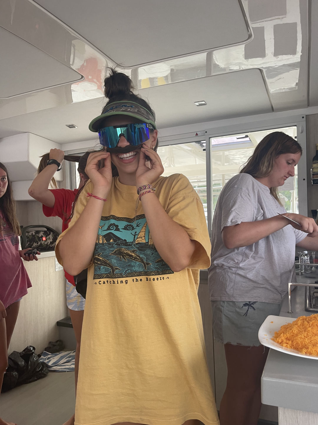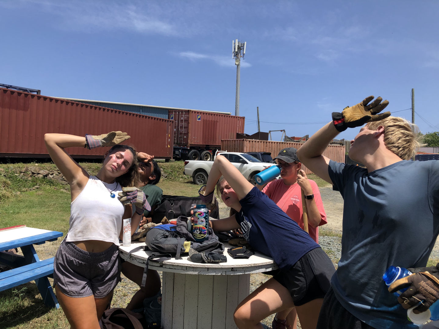 Meanwhile, Liam and Lily moved large boulders in order to create a clear pathway for ambulances and other vehicles. VISAR uses in critical situations. We also all ripped out our fair share of vines from bushes around the property. For lunch, we had, you guessed it, PB+J, however, without the jelly. To add some extra crunch, Shaila, Lily, and I added sliced apples to our peanut butter sandwiches. After lunch, we continued to weed and clean up the area outside the building. At 2:30, we finished our work for the day and got a tour of a rescue boat where Phil (a manager of the volunteer program) told us about VISAR and how it operates. Elle and Anna B. asked questions about the program and its origins. After this, we were surprised by ice cream, which was the highlight of everyone’s day. We then returned to the boat and finally were able to take showers in the cabin. Avah said taking a proper shower was her appreciation of the day. After showers, Morgan, Shaila, Elle, and Hannah used Riley’s sunglasses and Morgan’s hat in an attempt to dress up as teenage guys. Riley got incredible photographs of them in their element as Griffin laughed at them dressing up. For dinner, Avah and Chris cooked Mexican food for dinner, which was delicious. It was a long day filled with hard work, but it felt rewarding to give back to the local community.