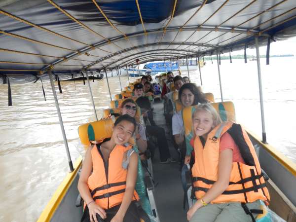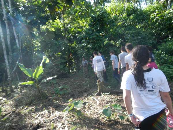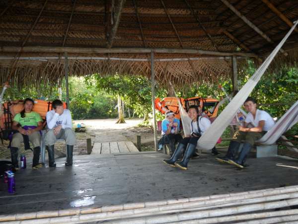 This morning we woke up at 7:00 and packed our bags for another morning of travel. Once we were all shuttled to the airport we went through the usual procedures for checking in and going through security. However, while we were waiting to board our airplane there apparently were some suspicious items in one of our suitcases. Somehow, lost through translation, we all thought that someone packed raw eggs in their suitcase. Thankfully no one actually packed raw eggs and it was only a container of bug spray. After we sorted out the baggage confusion, we boarded our plane for an hour-long flight. This flight consisted of sleeping and Disney songs like our days are usually filled with. When we landed we grabbed our luggage and took a bus ride to the dock and were given a sturdy pair of rain boots to help us with our excursions in the rainforest. We then loaded up the boat with ourselves and our belongings. The boat ride to the hotel was beautiful, the river water was a light brown color and the jungle flora engulfed the sides of the river. Towards the end of our boat ride it began to pour, luckily I was sitting towards the back so I did not get as wet as everyone else. When we pulled up to the lodge it was breathtaking. The only challenge was hauling our luggage up the endless flight of stairs. Fortunately at the top was the dining room with a rewarding lunch and hammocks to sleep in. After lunch we went to Hectors island, learned about the monkeys and hiked through the jungle. I was very thankful to be wearing my rainboots because it was very muddy and wet. Now we are showering and washing our muddy clothes before the electricity is turned off for the night! setdate:2012-07-09