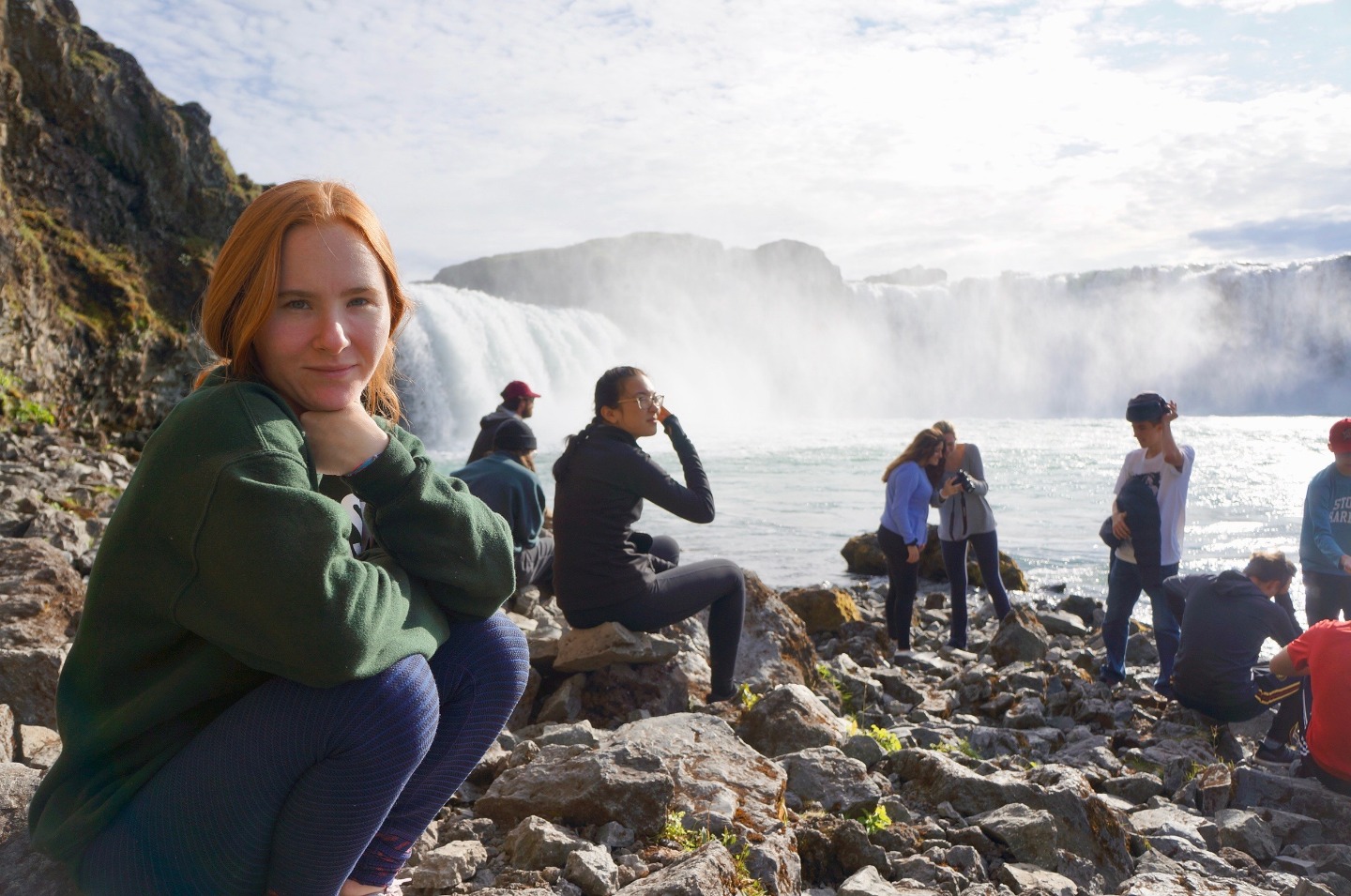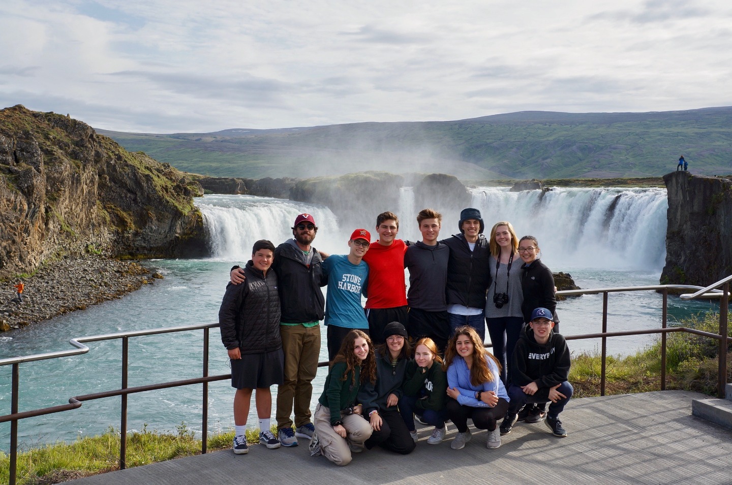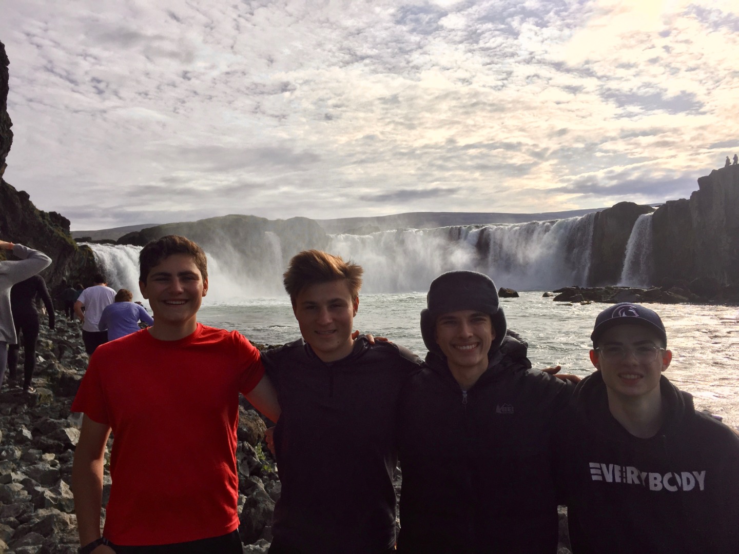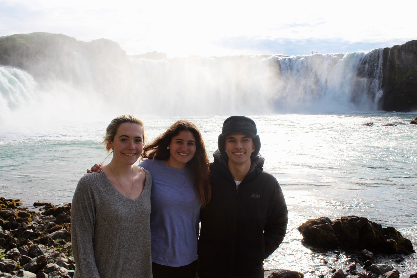 We woke up this morning around 8:45 again for breakfast before our seven-hour travel day out of Reykjavik. After some Cocoa Puffs, Skyr, and Nutella toast, we grabbed our bags and got on our bus. We talked and played two truths and a lie for a few hours before stopping for lunch along the way.. Back on the bus, we counted waterfalls, looked for horses and sheep, and occasionally cows for several hours. We later had another stop at a beautiful waterfall, Godafoss, where we took lots of pictures and explored for an hour. Then Sofi and I tried on furry hats for a solid half hour in the store before getting back on the bus. For the last few hours on the bus, we learned slang from our home towns and got to know each other a lot better. We saw an island inhabited by puffins, small penguin-like birds that can fly. At the end of the day, the seven hour bus drive had turned into a 10 hour travel day. When we finally arrived, we got our roommate assignments and everybody explored around the community while Sofi, Max, and I cooked dinner at 9:15. Even though it was a travel day, we still got to see amazing views and had a fun day.