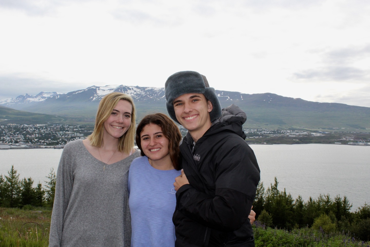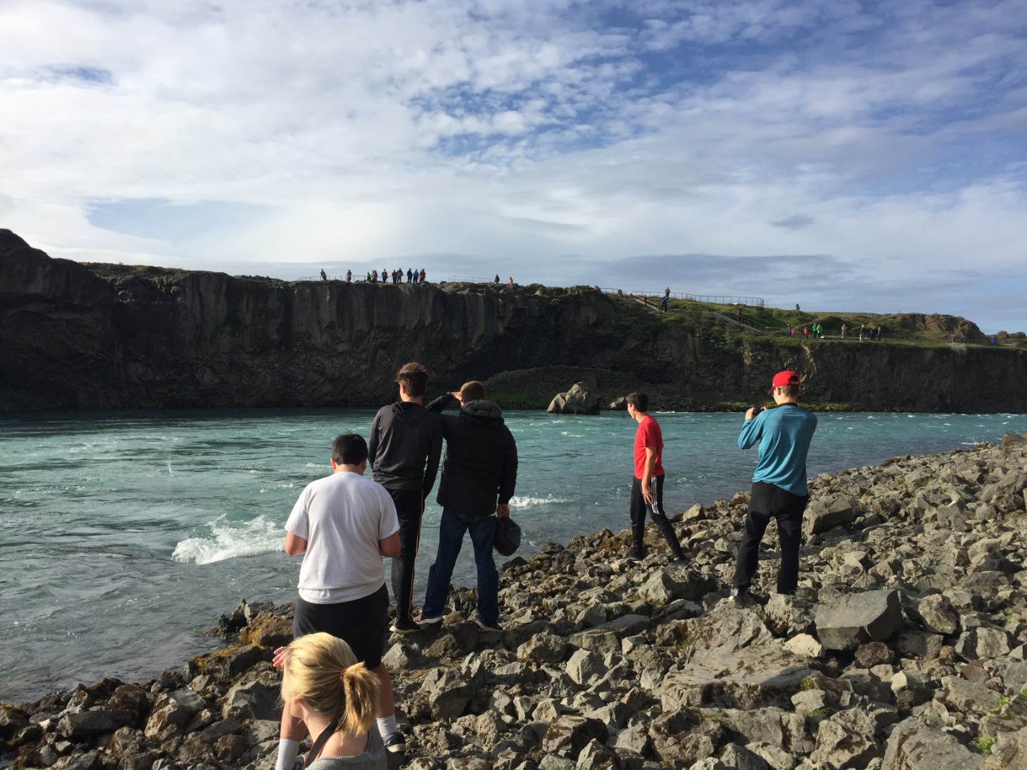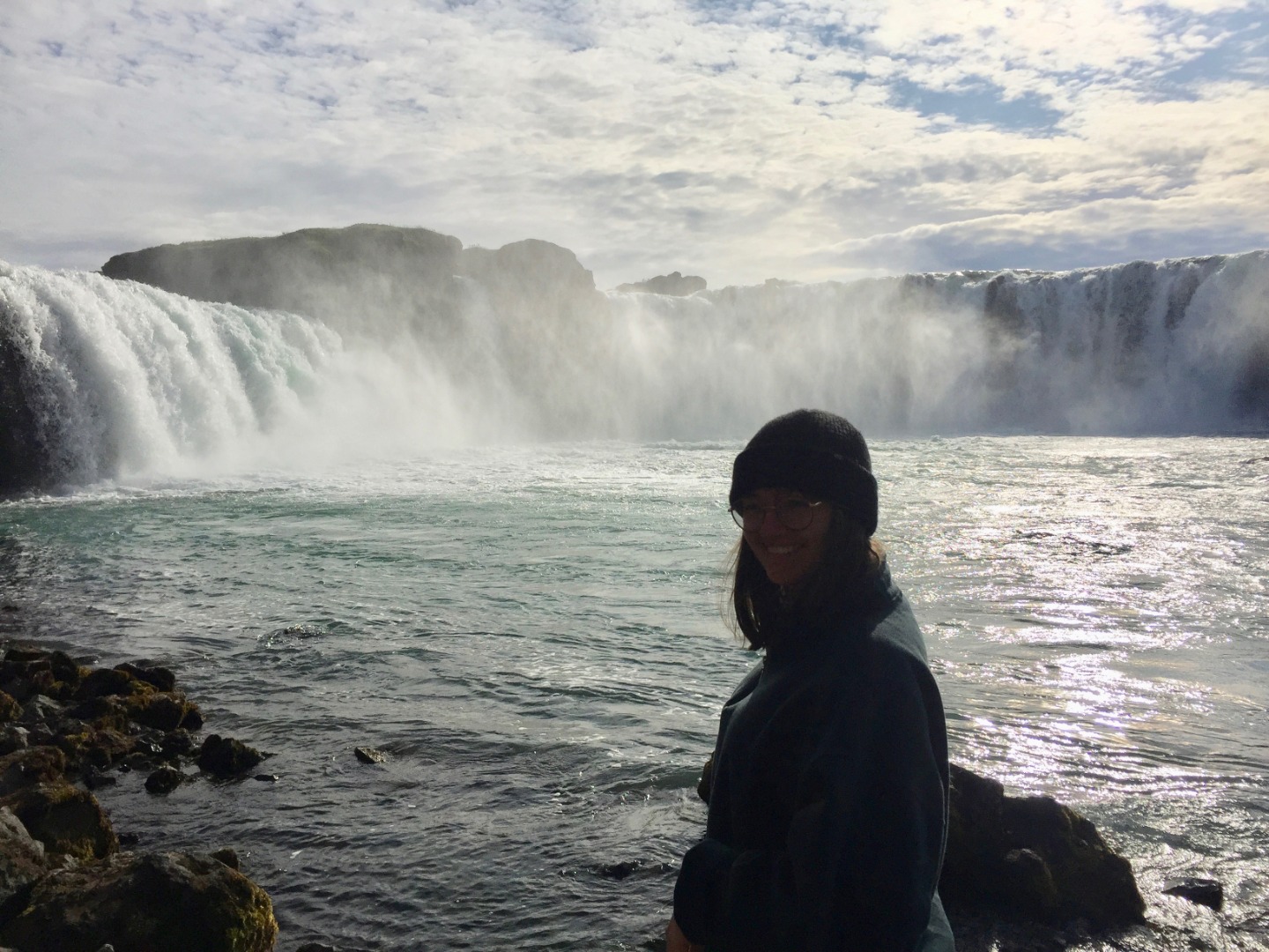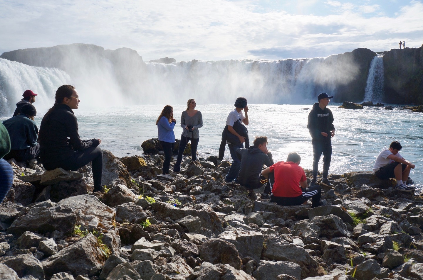 We woke up this morning around 8:45 again for breakfast before our seven-hour travel day out of Reykjavik. After some Cocoa Puffs, Skyr, and Nutella toast, we grabbed our bags and got on our bus. We talked and played two truths and a lie for a few hours before stopping for lunch along the way.. Back on the bus, we counted waterfalls, looked for horses and sheep, and occasionally cows for several hours. We later had another stop at a beautiful waterfall, Godafoss, where we took lots of pictures and explored for an hour. Then Sofi and I tried on furry hats for a solid half hour in the store before getting back on the bus. For the last few hours on the bus, we learned slang from our home towns and got to know each other a lot better. We saw an island inhabited by puffins, small penguin-like birds that can fly. At the end of the day, the seven hour bus drive had turned into a 10 hour travel day. When we finally arrived, we got our roommate assignments and everybody explored around the community while Sofi, Max, and I cooked dinner at 9:15. Even though it was a travel day, we still got to see amazing views and had a fun day.